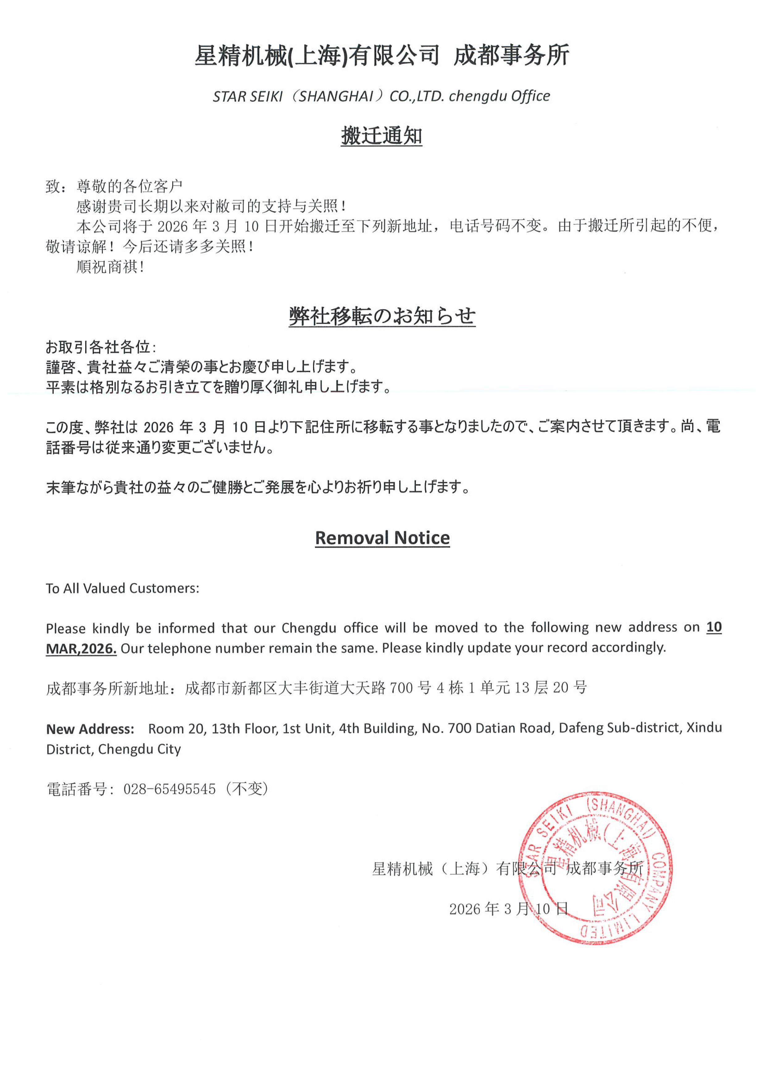 成都事務所 移転のお知らせ